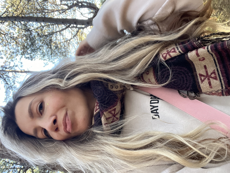 A close-up, chest-up self-portrait of a female is depicted in an outdoor setting within Kavač, Montenegro. The individual has long, wavy, blonde hair with lighter highlights, draped over her shoulders. Her head is slightly tilted, and she looks directly at the camera with a neutral expression and slightly pursed lips. Small, golden glitter particles are visible on her left cheek, near the outer corner of her eye. She wears a light-colored sweatshirt or sweater, partially obscured by a patterned scarf wrapped around her neck. The scarf features dark and beige sections with geometric designs, including cross-like and circular motifs, and visible fringe. A pink strap, possibly from a bag, crosses her chest diagonally. Her right hand is raised, with fingers lightly touching the hair near her right ear. The background consists of pine or conifer trees with visible trunks and sparse foliage, set against a bright, clear sky, indicating daytime.