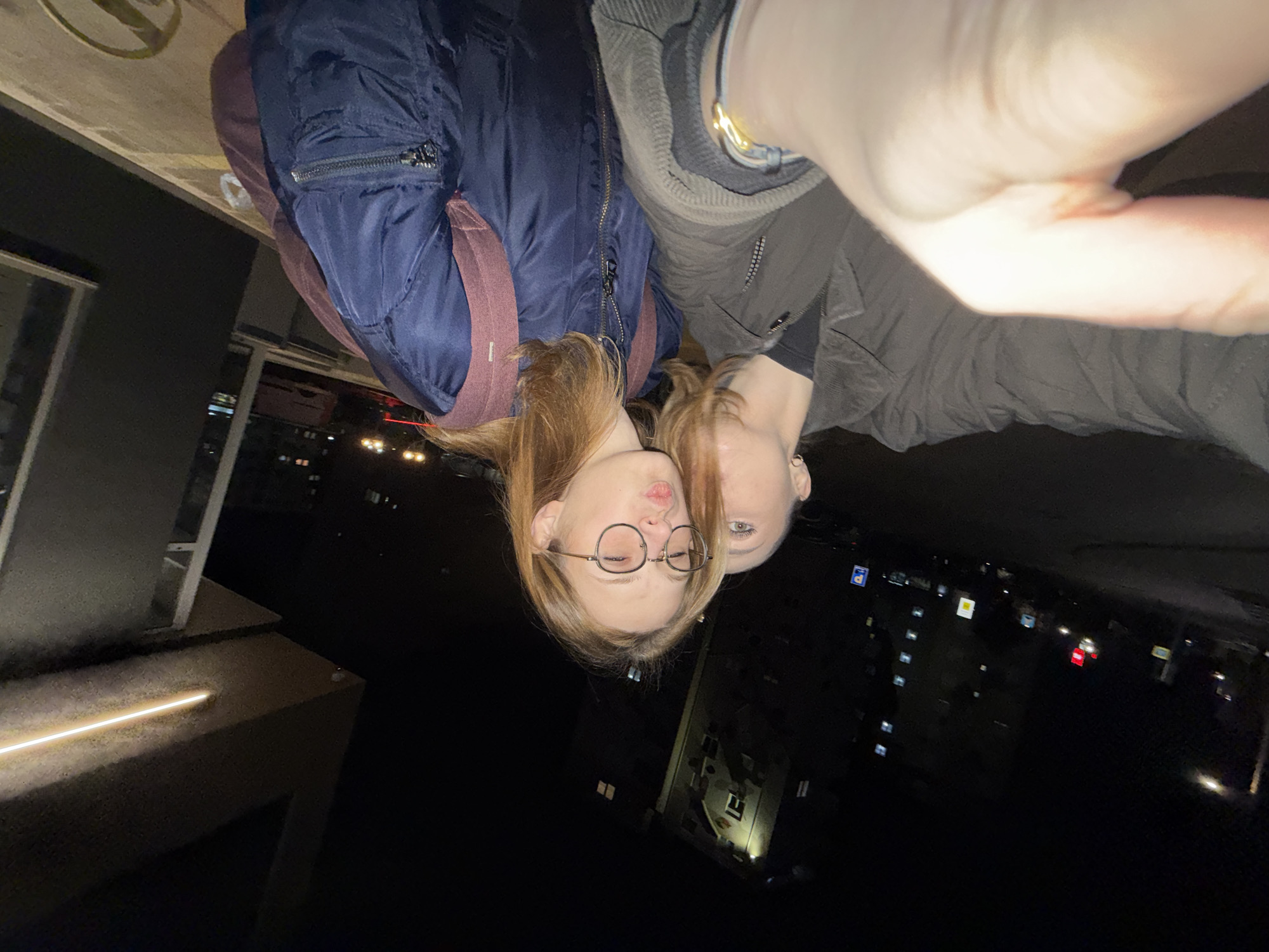 The scene is a nighttime self-portrait photograph, taken from an elevated outdoor position overlooking a city street, identified as occurring in Kragujevac, Serbia. The image is vertically oriented relative to the subjects. Two individuals are depicted. In the foreground, partially visible on the right, is a pale-skinned hand holding the camera, with a small portion of a chin, an ear with a hoop earring, and a shoulder covered by a dark grey, textured jacket (possibly corduroy). A gold-colored bracelet is worn on the wrist. Positioned behind and to the left of the foreground individual is a second individual, female, with light brown hair and round, thin-framed eyeglasses. She looks towards the camera with puckered lips. She is wearing a dark blue bomber jacket with zippered pockets, over a burgundy-colored garment. Her head is angled close to the foreground individual's head. The background, illuminated by artificial light sources, depicts a dark cityscape. To the upper left, a building structure with a prominent linear light fixture is visible. Below, several distant buildings with illuminated windows are discernible. Further below, streetlights and vehicle lights, including red taillights and white headlights, indicate a road or intersection. A faint blue square sign is visible in the middle distance to the right.
