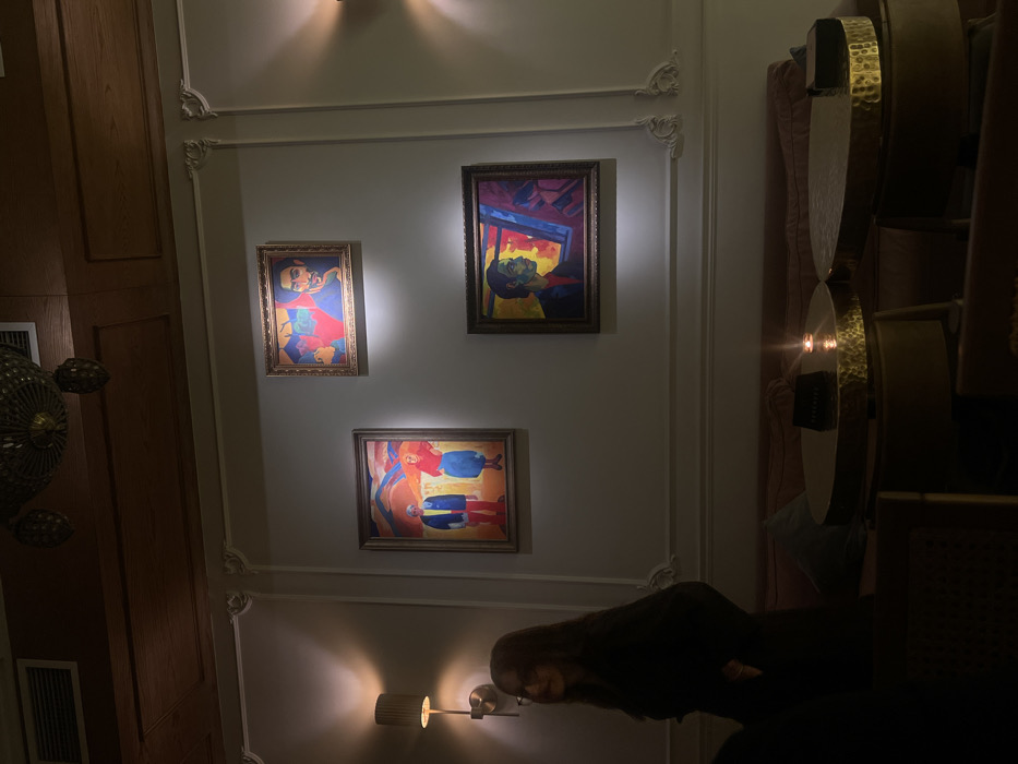 An indoor scene within an establishment, likely a lounge or restaurant, in Yerevan, Armenia, is depicted under dim lighting. Three framed, vibrantly colored abstract or semi-abstract paintings are mounted on a light-toned wall featuring decorative molding along the top and base. The top-left painting portrays two standing figures; the top-right shows a man's face; and the bottom-right presents a profile of a green-skinned figure. A dark wooden paneled ceiling, equipped with two rectangular ventilation grilles and a central decorative metallic chandelier, is visible overhead. Wall sconces provide upward ambient illumination, with one prominent on the left and another partially visible on the right. Below the artwork, a long, light-pink upholstered bench with light blue throw pillows lines the wall. Two circular tables, featuring hammered brass-finish tops, are positioned in the mid-ground; one displays a lit candle or tea light and a "RESERVED" sign. In the foreground on the left, a woman with dark hair and glasses, wearing a dark top, is partially visible, facing towards the right side of the frame. Dark chairs are partially visible in the immediate foreground, obscuring the lower portions of the tables.