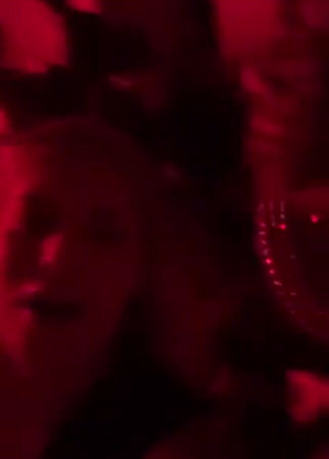 young woman at a party. The lighting is dark red, and there are other people in the background, some with their hands raised. The woman looks at the camera and makes a kissy face. A man's face briefly appears above her. The video is shaky and seems to be taken with a phone.