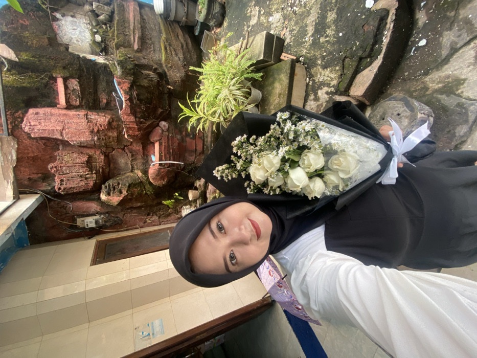 A woman in a hijab holds a bouquet of white roses wrapped in black paper and tied with a white ribbon. She is standing outdoors, possibly in a courtyard or garden area. Behind her, there is a rock formation or waterfall feature, and various potted plants. The woman is facing the camera with a slight smile. The background includes a building with tiled walls and a doorframe.