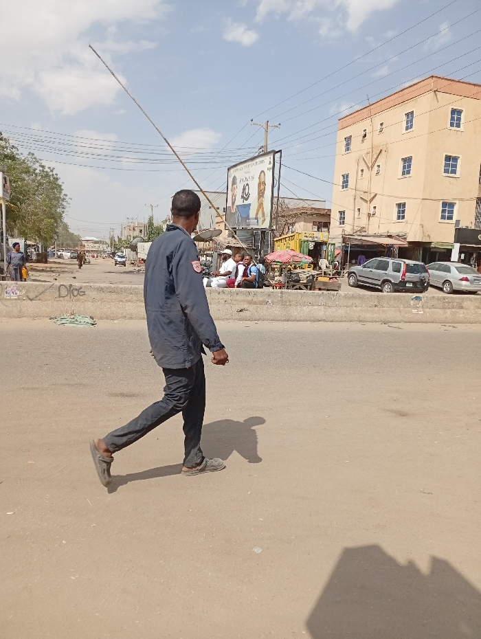 An outdoor daylight scene in Sabon Gari East, Nigeria, depicts a busy urban street environment under a partly cloudy sky. In the foreground, a male subject, viewed from the back and slightly to the right, walks across a light brown asphalt road surface from left to right. He wears a dark blue long-sleeved coverall or uniform with a red patch on the left shoulder, dark trousers, and grey slip-on sandals. He holds a long, thin, light-colored stick, approximately 2-3 meters in length, diagonally upwards toward the sky. His shadow is cast on the road. Behind the walking subject, a low concrete barrier with visible graffiti reading "DICE" separates the immediate foreground from the opposing side of the road. Across this barrier, on the right side of the image, multiple individuals are gathered near street stalls, some seated under a red canopy and others standing. A large billboard, featuring two male portraits and text against a blue background, is prominent above these individuals. Utility poles and overhead power lines span the midground. To the far right, a multi-story, light brown building with numerous blue-framed windows is visible. Two parked vehicles, a silver SUV and a silver sedan, are positioned in front of this building. On the left side of the road, in the distance, additional vehicles, buildings, and trees line the street, indicating ongoing traffic and urban infrastructure.