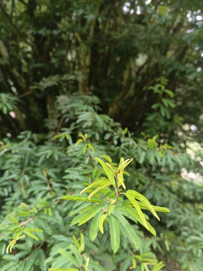 The scene is an outdoor natural environment in Masaiti, Zambia, dominated by dense vegetation. In the immediate foreground, a single sprig of new plant growth is in sharp focus, displaying vibrant light green compound leaves with multiple small leaflets. The stem of this growth is reddish-brown. The midground consists of a blurred mass of similar, slightly darker green foliage, indicative of a bush or shrub. The background is an indistinct, heavily out-of-focus expanse of dark green leaves and tree trunks, suggesting a forested or heavily vegetated area. Natural, diffused daylight illuminates the scene. No individuals, animals, or artificial structures are visible.