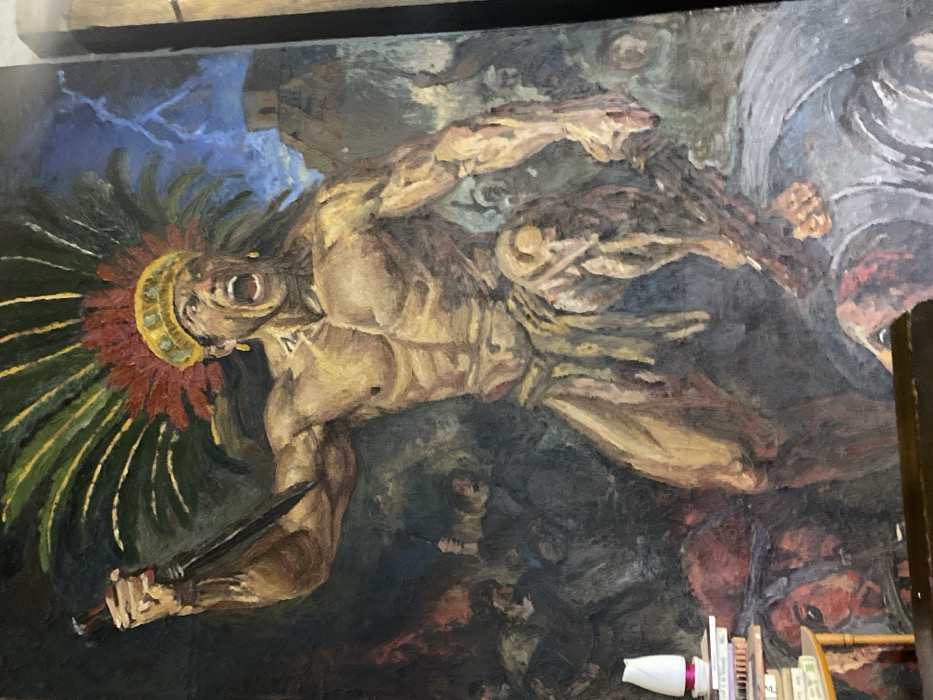 An oil painting depicts a muscular, Indigenous warrior in a headdress, wielding a dagger