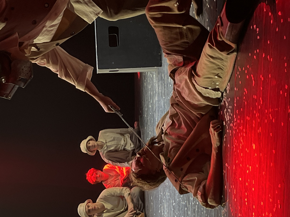 The image depicts a theatrical performance on a stage in Novoshakhtinsk, Russia. In the immediate foreground, a person lies supine on a dark stage floor, dressed in a light-colored, loose-fitting shirt and trousers. Their head is slightly raised, with eyes open. A thin, silver-colored prop blade extends across their throat, held by the right hand of a standing figure positioned to the right, partially visible. This standing figure wears light-colored attire, including a vest-like garment, and a dark, possibly metal, helmet or mask. The stage floor around the prone individual and on their clothing is covered with numerous small, white, square-shaped confetti pieces. The foreground is strongly illuminated by red stage lighting. In the background to the left, three additional individuals are seated cross-legged on the stage floor, observing the action. Two of these figures wear light-colored bucket hats and light-colored clothing; the central seated figure is distinctly highlighted by a strong red light. A dark, rectangular stage block with a cutout handle is visible in the mid-ground on the right side of the stage. The background is dark, emphasizing the lit performance area.
