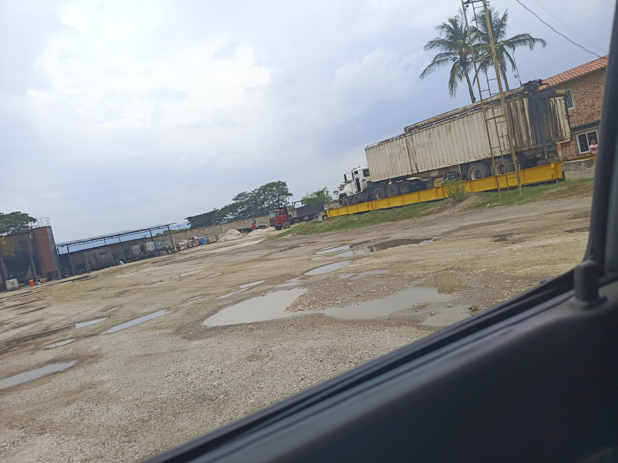 The scene depicts an industrial yard in El Bajío, Venezuela. The ground is gravel and dirt with numerous puddles. A semi-truck with a large white trailer is parked on a yellow platform scale. Behind the truck is a two-story red brick building with a tiled roof and several palm trees. In the background, there are other industrial structures, including what appears to be a tank and a covered area. A red truck is visible in the distance. The sky is overcast. The photo is taken from inside a vehicle, with a portion of the vehicle's interior visible in the lower right corner.