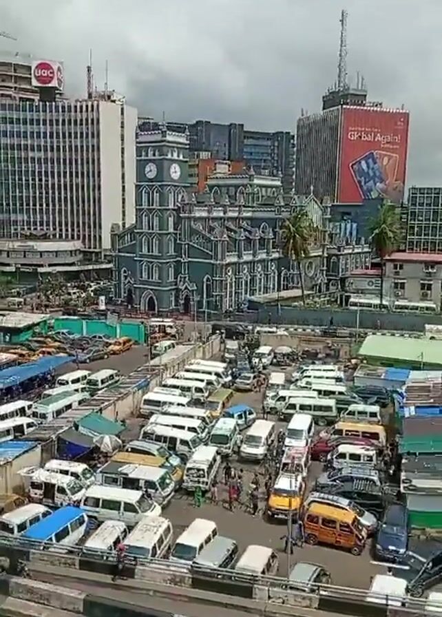n elevated view of a city scene with a large parking area filled with white and yellow vans, surrounded by buildings. A gray, multi-story church-like structure with clock towers is in the background. There is also a tall building with a large red advertisement that reads "Glo-bal Again!" A smaller lot with parked cars, mostly black, grey, and red, sits beside the busy van parking. People walk around the vans and along the street. The sky is overcast.