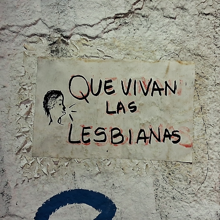 The image displays a weathered, rectangular piece of off-white paper adhered to a heavily textured, peeling white wall. The paper bears handwritten black text, partially outlined in red, which reads "QUE VIVAN LAS LESBIANAS" (Long live lesbians). To the left of the text, a black ink drawing depicts the profile of a human head with an open mouth, from which three short lines emanate, indicating speech. The wall exhibits widespread cracking, flaking paint, and areas of discoloration. Below the paper, a segment of a blue painted circle is visible on the wall. The scene is located in San Fernando del Valle de Catamarca, Argentina.