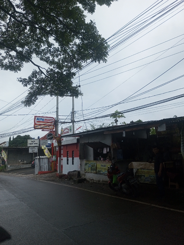 A street scene shows a wet asphalt road next to a small roadside shop, adjacent to an Alfamart convenience store. Power lines crisscross overhead. The Alfamart has red and white painted pillars. A person stands in the shadow of the roadside shop near a parked motorcycle. A large tree overhangs the scene on the left. The sky is overcast.