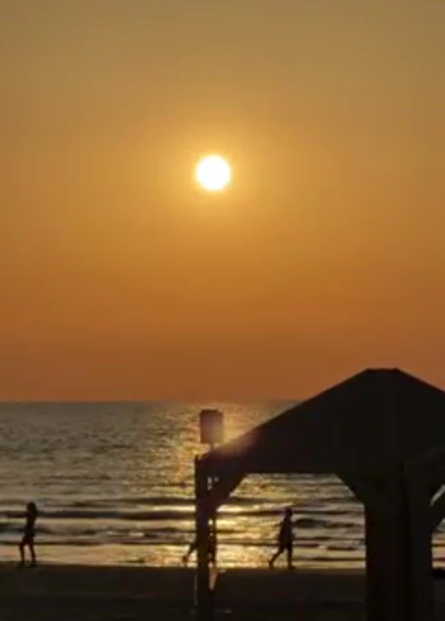 sunset scene at a beach. The sun is a bright white orb in the center of the frame, casting a warm orange glow across the sky. Below, the ocean stretches to the horizon with gentle waves visible. A dark, silhouetted structure, possibly a shelter or gazebo, stands on the sand in the foreground. Several silhouetted figures of people are visible on the beach, some appear to be walking or running along the shoreline. One figure is holding a round object, possibly a ball. The entire scene is captured in a vertical orientation.