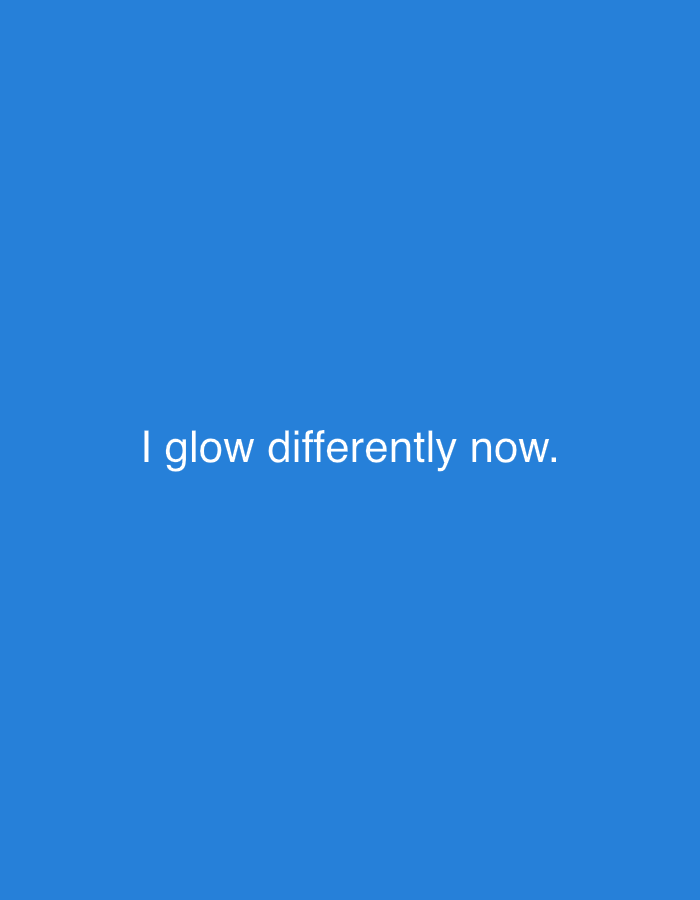 The image displays a solid, uniform medium-blue background. Centered both horizontally and vertically on this field is a single line of white, sans-serif text stating: "I glow differently now." No people, discernible objects other than the text, actions, or specific environmental features are present. The image is a graphical composition and does not visually represent a physical location or specific scene within the city of Zango-ndaji, Nigeria, or any other geographical area.