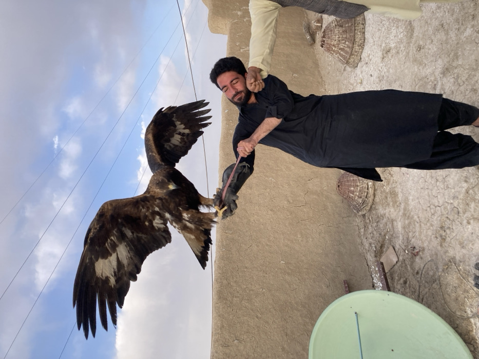 - "An outdoor scene captured on a flat rooftop in Qilla Saifullah, Pakistan, features two individuals interacting with a large raptor under a partly cloudy sky" by FM-7ELnX2, licensed under CC BY 4.0