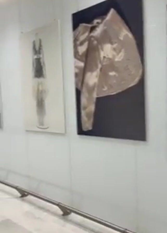 The camera travels through a well-lit corridor, possibly in an airport or gallery, with a marble tile floor and a series of framed artworks hanging on the white wall
