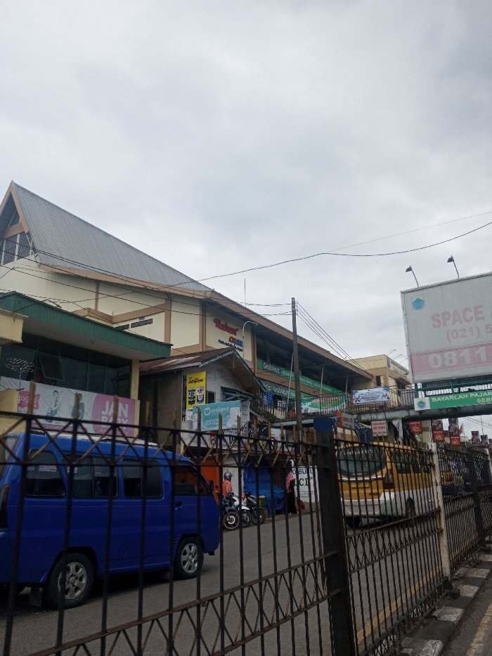 The image depicts an urban street scene under an overcast sky. In the foreground, a dark metal fence with decorative patterns runs horizontally, partially obscuring the street beyond. On the street, a blue minivan is positioned on the left, facing right, with its silver wheels visible. Further down the street to the right, a yellow van of similar style is visible, also partially obscured by the fence. Between these vehicles, several motorcycles are parked or moving slowly; one person in an orange jacket is visible near a motorcycle. The background is dominated by a multi-story building complex. The largest structure features a prominent A-frame or gable roof, made of corrugated metal, atop a light brown/beige facade with green accents. Signs on this building include "Maluang" in red script and "GrabMart" in green lettering. Below this main structure, smaller, more ad-hoc commercial stalls or storefronts are present, displaying signs such as "POWER" and "Omiland." To the far right, a large billboard with the text "SPACE A" and a phone number starting "(021)" is prominently displayed. Below it, text including "BAYARLAH PAJAK SEBUAH KOTA" is visible. Overhead utility wires traverse the sky. The visible linguistic and numerical cues on the signage, such as "BAYARLAH PAJAK SEBUAH KOTA" and the (021) phone prefix, are consistent with Indonesia, not Ariyalai, Sri Lanka.