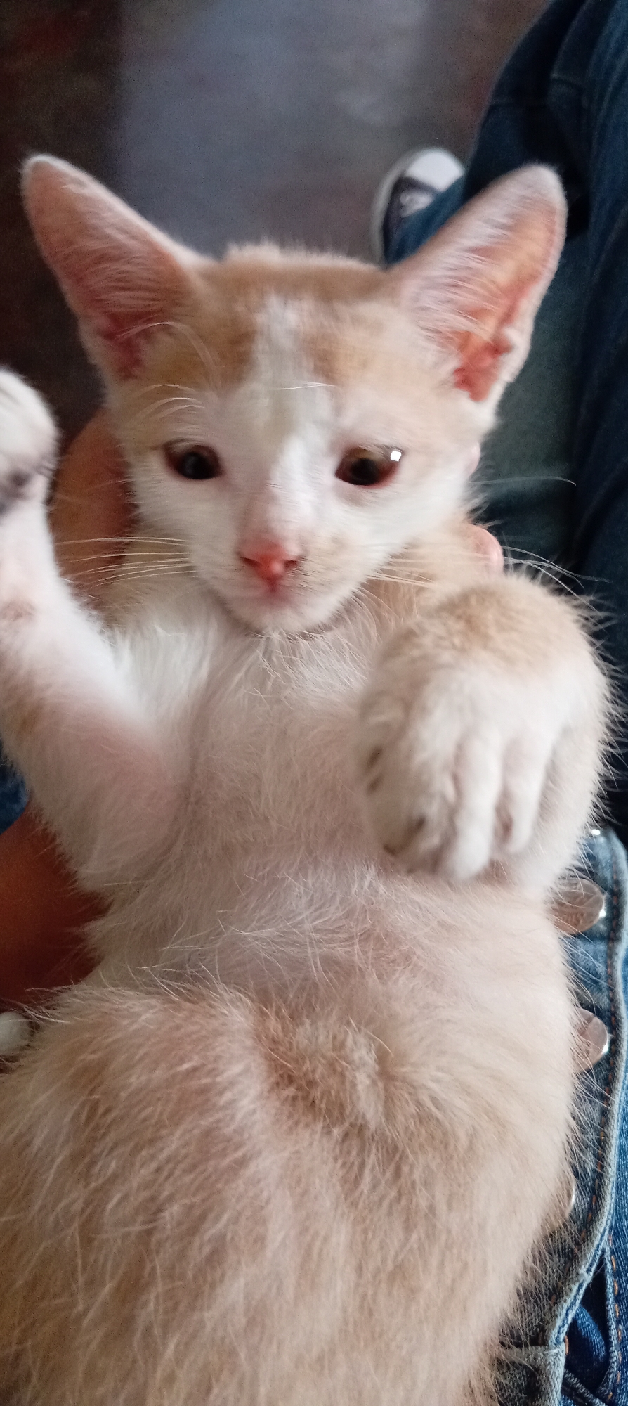 - "The image displays a light orange and white kitten held by a person in an indoor setting in Tinaquillo, Venezuela" by FM-DhFfC2, licensed under CC BY 4.0