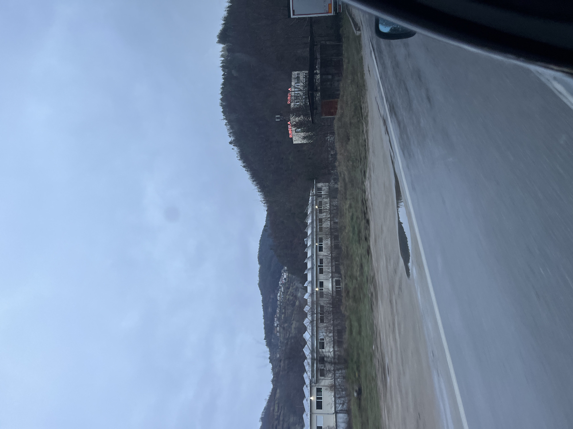 The image depicts a roadside view in Rudozem, Bulgaria, under an overcast sky. The foreground shows a wet asphalt road with a partial white lane marking on the left, and a dirt/gravel shoulder containing a small puddle. The scene is observed from within a vehicle, with a portion of a dark door frame and a blue side mirror visible on the right. In the midground, to the left, stands a long, single-story, light-colored industrial-style building featuring a sawtooth roof design and multiple rectangular windows. Bare deciduous trees and sparse bushes are situated in front of this building. Further right and slightly behind, a multi-story building with a light facade is partially visible, featuring a red illuminated sign on its roof that reads "RUBELLA" multiple times. In front of this building is a smaller, dilapidated, dark-colored structure, possibly a shed, next to which a portion of a white truck or trailer is visible on the far right. The background consists of forested hills and mountains. On the left hillside, a cluster of residential buildings forms a small settlement. The overall lighting suggests an overcast day, possibly late autumn or winter, given the bare tree branches. No individuals are visible.