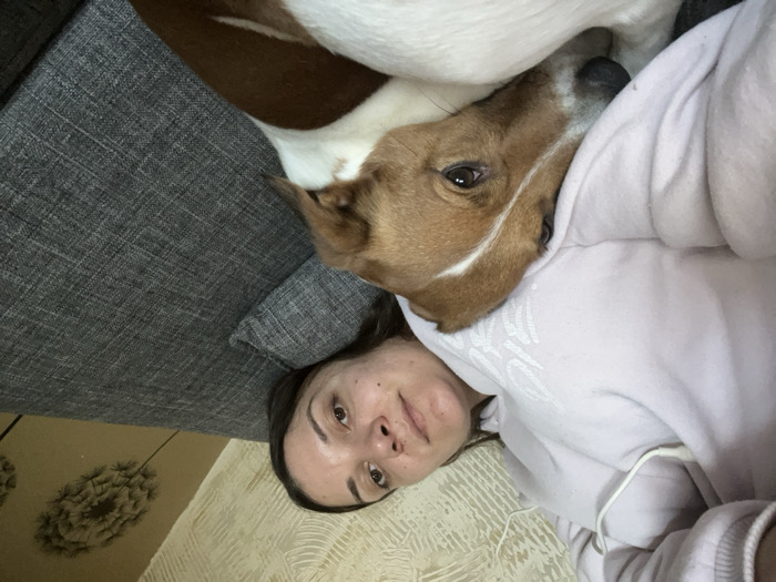 The scene is set indoors within the city of Lom, Bulgaria, depicting an adult female and a dog. The female, with dark hair, lies on her back, looking towards the viewer. She wears a light-colored hooded sweatshirt. Resting on her chest, partially beneath the sweatshirt, is a small to medium-sized dog with short brown and white fur, its eyes open. Both subjects are positioned on a grey fabric sofa or couch. The background wall features two sections of wallpaper: a light-colored, textured pattern on the left, and a darker, possibly beige section on the right adorned with a repeating botanical motif resembling dandelion seed heads.