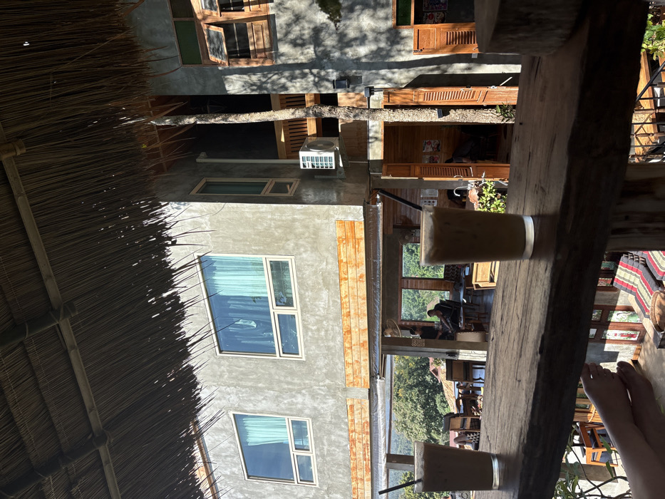 From a partially shaded vantage point, a multi-story building with varying window styles anchors the left side. Drinks in glasses sit on a wooden beam overlooking an outdoor space with foliage. People are visible in the distance. Bare feet rest in the bottom right corner.