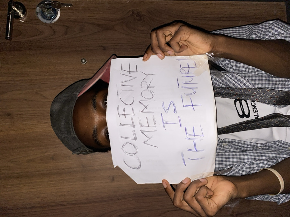 A person in a gray and red cap lies on a wooden floor. Part of their face is obscured by a white paper sheet held with both hands. The paper reads "COLLECTIVE MEMORY IS THE FUTURE." They are wearing a white shirt with black text and a patterned gray and white button-down shirt. In the top left corner are a doorknob, deadbolt, and keys. A small metal object is also visible on the floor.