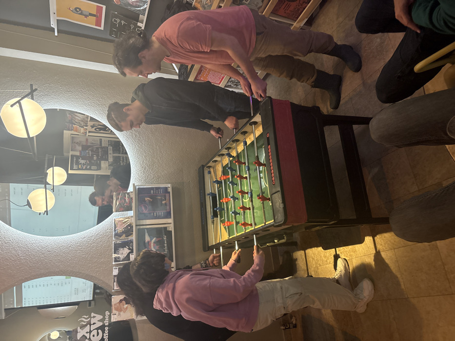 Four people are playing foosball in an indoor setting. Two face the camera wearing a light purple hoodie and a black shirt and light-colored pants, respectively. The other two players face away from the camera, wearing a pink shirt and a dark gray shirt, with dark pants. A large round mirror reflects the foosball players. A "Brew Coffee Shop" sign is visible near the mirror. The floor is a patterned tile.