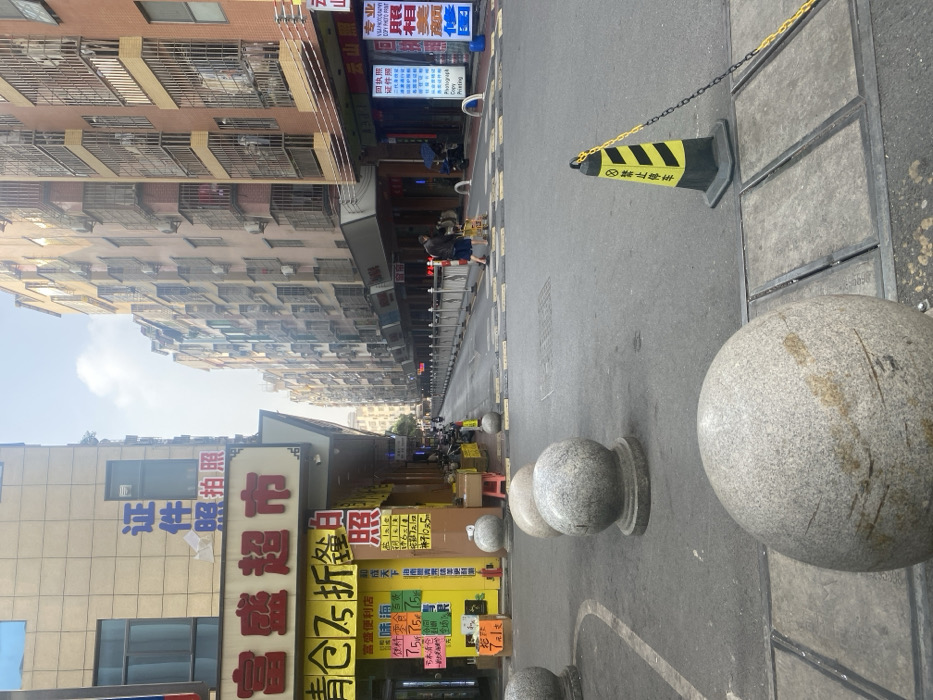 The image depicts a street scene in Asia with dense buildings. On the left are structures with small balconies. Numerous storefronts line the street level. Signs indicate a supermarket ("富盛超市"), a photography studio ("照拍照", "证件照"), and a discount sale ("青仓7折簽"). Some store signs display prices. A traffic cone and stone bollards delineate the pedestrian path. A sign indicates "禁止停车" (no parking).