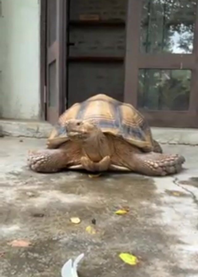 large tortoise sitting on a concrete patio in front of a building. The tortoise is facing the camera with its head extended and its legs spread out. Its shell is a light brown color with dark brown markings. The patio is wet and there are a few scattered leaves and a white flower on the ground. Behind the tortoise, there is a building with a set of dark brown doors that are slightly ajar. There are shelves visible inside the building.