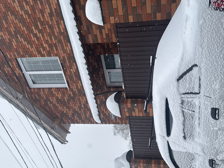 The image depicts a street scene on Shkolnaya Street in Chaikovsky, Russia, during active snowfall under an overcast grey sky. A two-story residential building, constructed from variegated reddish-brown and tan bricks, occupies the mid-ground. Its gabled roof is partially covered in snow, revealing exposed wooden support structures beneath the eaves. The upper story features a white-framed casement window with a grid pattern. Below this, a white corrugated awning, also covered in snow, extends over a lower section where a smaller white-framed window is partially visible behind a fence. The fence is composed of dark brown corrugated metal panels interspersed with brick pillars, which match the house's brickwork. The dome-shaped caps of these pillars are heavily laden with fresh snow. A rectangular white street sign, bearing the black Cyrillic inscription "ШКОЛЬНАЯ" (Shkolnaya), is affixed to one of the brick fence pillars. In the immediate foreground, the roof and upper body of a light-colored vehicle, equipped with roof rails, are completely obscured by a thick, even layer of freshly fallen snow, with only the faint outlines of windows and door handles discernible. Several black utility wires traverse the upper left quadrant of the frame. A bare deciduous tree is visible in the distant background. No individuals are present in the scene.