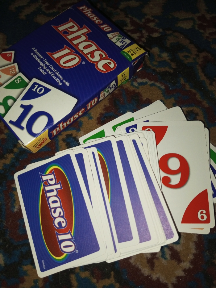 A deck of Phase 10 cards rests on a patterned surface near the game box