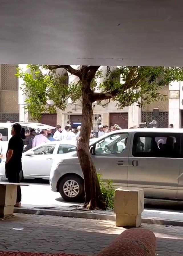 The video, taken from under the shelter of a building, reveals an outdoor urban scene featuring a small tree centered in the foreground, partially obscuring the view. Several cars are parked along the street, including a white sedan, a silver minivan, and a white van. A group of people congregates near a building across the street, some wearing traditional Islamic attire. Individuals in the crowd are seen walking and milling about. The environment appears to be a sunny day in a Middle Eastern city, with the building across the street exhibiting an architectural style typical of the region. A red carpet is visible in the foreground, suggesting the viewer is in an area intended for seating or relaxation.