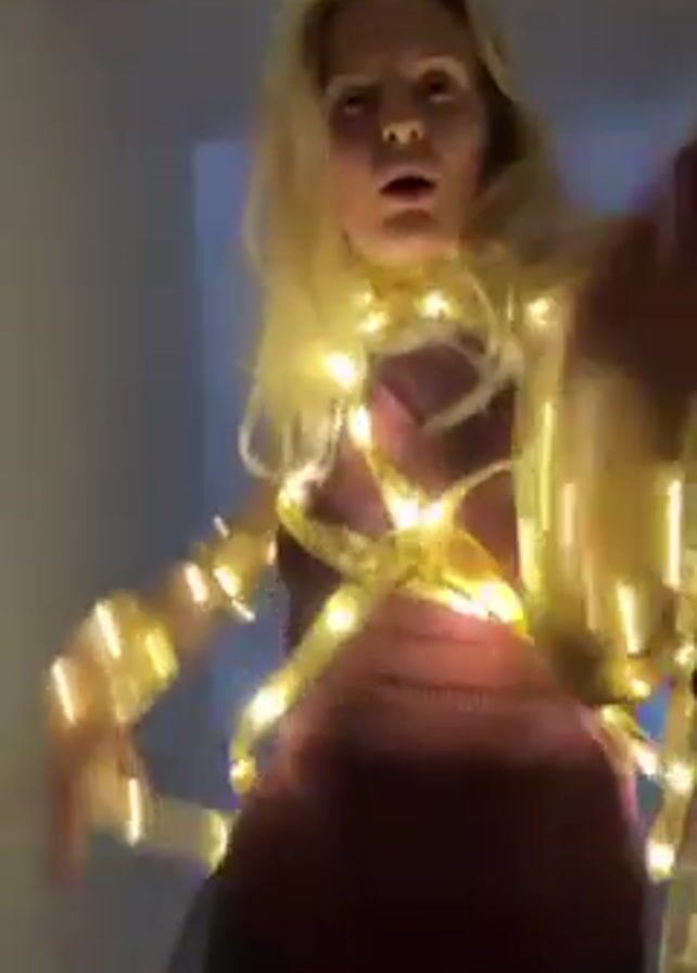 A fair-skinned woman with blonde hair is dancing in a hallway. She is wearing a dark maroon tank top and dark leggings. She is wrapped in a string of yellow Christmas lights and has a star-shaped light on top of her head, like a Christmas tree topper. The hallway has white walls, dark doors, and a brown floor. The lighting is bright, highlighting the lights on the woman. She moves her arms and body while looking into the camera, moving her lips but no sound.