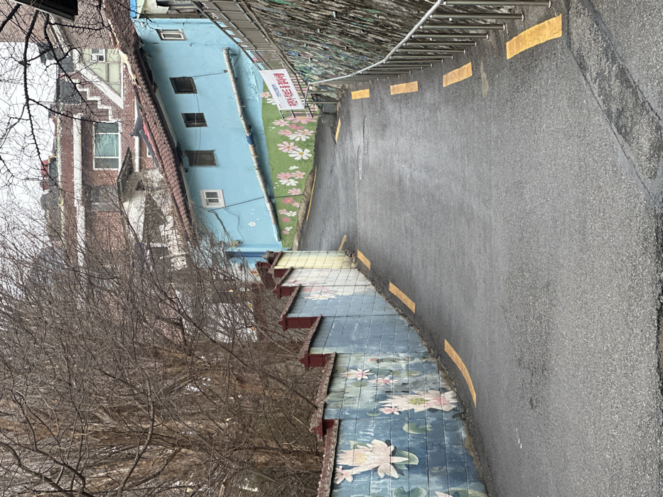 An uphill asphalt road with yellow stripes is lined by buildings with murals. A blue building has daisy-patterned wall art. A brick building is partially visible behind bare tree branches. The mural along the road’s edge depicts blue tiles with lotus flowers. The road is flanked by a wall, topped with a silver metal railing.