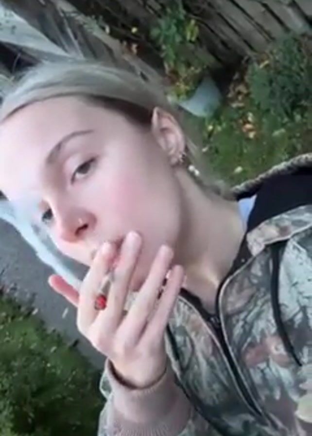 A young woman with blonde hair is holding a lit cigarette or joint in her left hand. She is wearing a camouflage jacket. Smoke is coming from the lit end of the cigarette or joint. The background includes a fence, grass, and a building. The camera appears to be handheld, positioned at a slightly low angle.