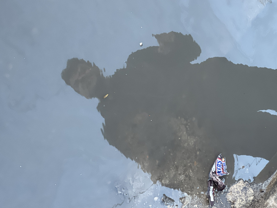 The scene depicts a close-up view of a shallow, still body of turbid greyish-brown water located in the city of Qudsaiya, Syria. A dark, inverted reflection of a human figure is prominently visible, showing the upper torso and head in the central and left portions of the water's surface. The reflection indicates an individual standing above and observing the water; specific facial features are not discernible. Along the upper right edge of the water, a crumpled "SNICKERS" candy wrapper is partially submerged, resting against an irregular, dark bank composed of earth and scattered debris. Minor fragments of debris are visible within the water. A small, light-colored, elongated object floats near the reflected head. The water's surface exhibits subtle reflections of an overhead light source.