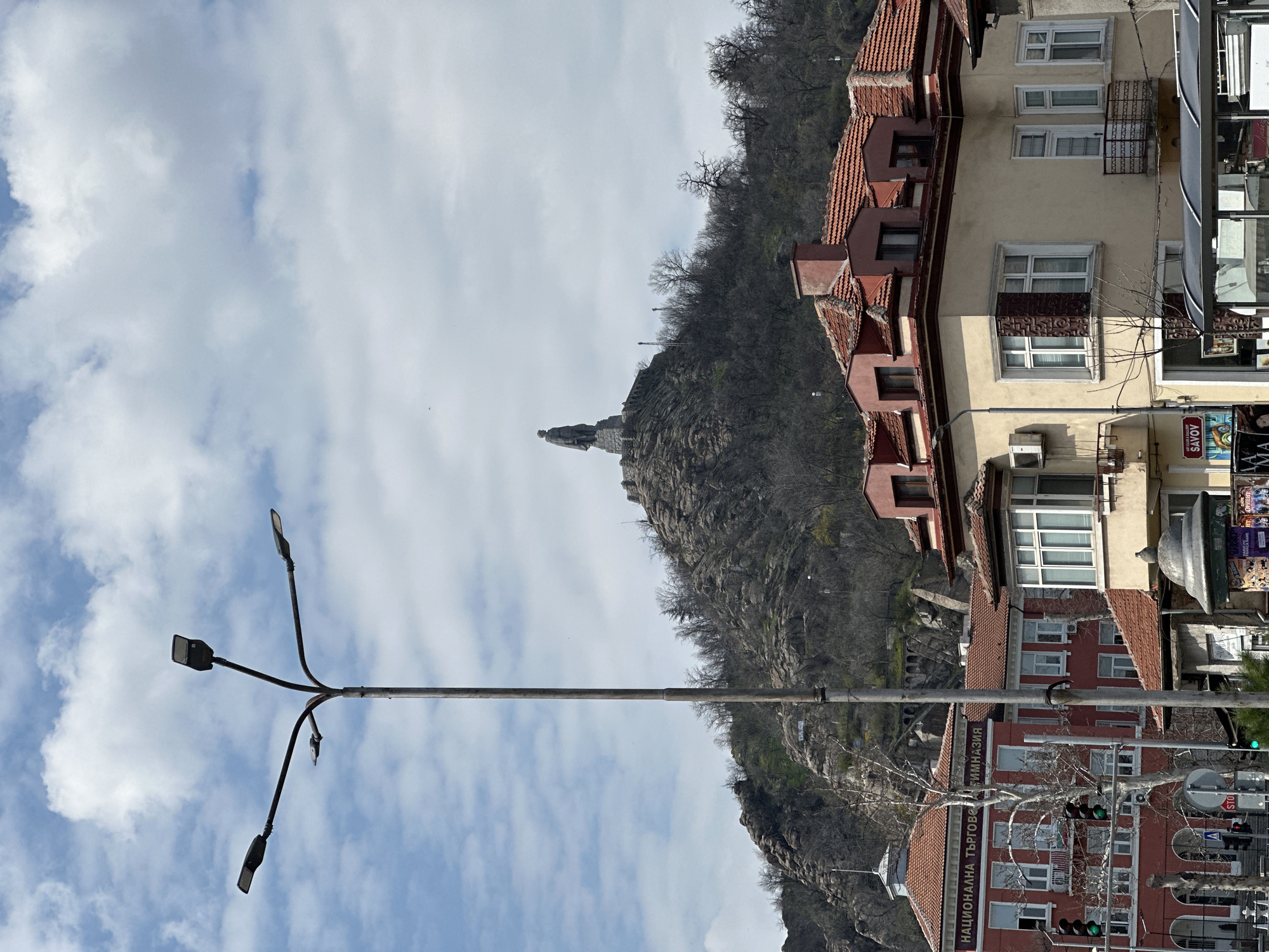 The image depicts a street scene in Plovdiv, Bulgaria, with Bunardzhik Hill and the Alyosha Monument as a prominent backdrop. The monument, a large stone statue of a Soviet soldier, stands on the peak of the rocky, sparsely vegetated hill, which is covered with leafless deciduous trees. In the mid-ground, below the hill, is an urban environment. To the left, a large, multi-story red building with "НАЦИОНАЛНА ТЪРГОВСКА ГИМНАЗИЯ" (National Trade High School) inscribed in white Cyrillic letters across its upper facade is visible. It features numerous windows and a decorative cupola. Adjacent to it, on the right, is a light-yellow building with a red-tiled roof, multiple dormer windows, bay windows, and small balconies with metal railings. The roofline includes several chimneys. In the immediate foreground, a tall, dark gray utility pole with four outward-curving arms, each supporting a modern street light fixture, rises centrally. To its left, traffic lights showing green are visible, along with a red octagonal STOP sign. To the right, part of a dark, curved bus stop shelter is present, with commercial posters on a nearby stand. The sky above is partially cloudy with white and gray cumulus clouds. No discernible human figures are prominent.