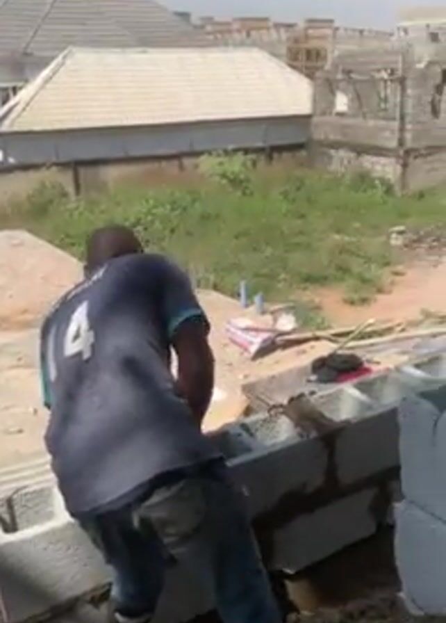 construction site where several workers are building a wall. The wall is made of large grey concrete blocks. One worker is placing blocks, while others are working further down the wall. Scaffolding made of bamboo poles is erected alongside the construction. In the background, there are other buildings under construction and vegetation. The sky is clear and bright.