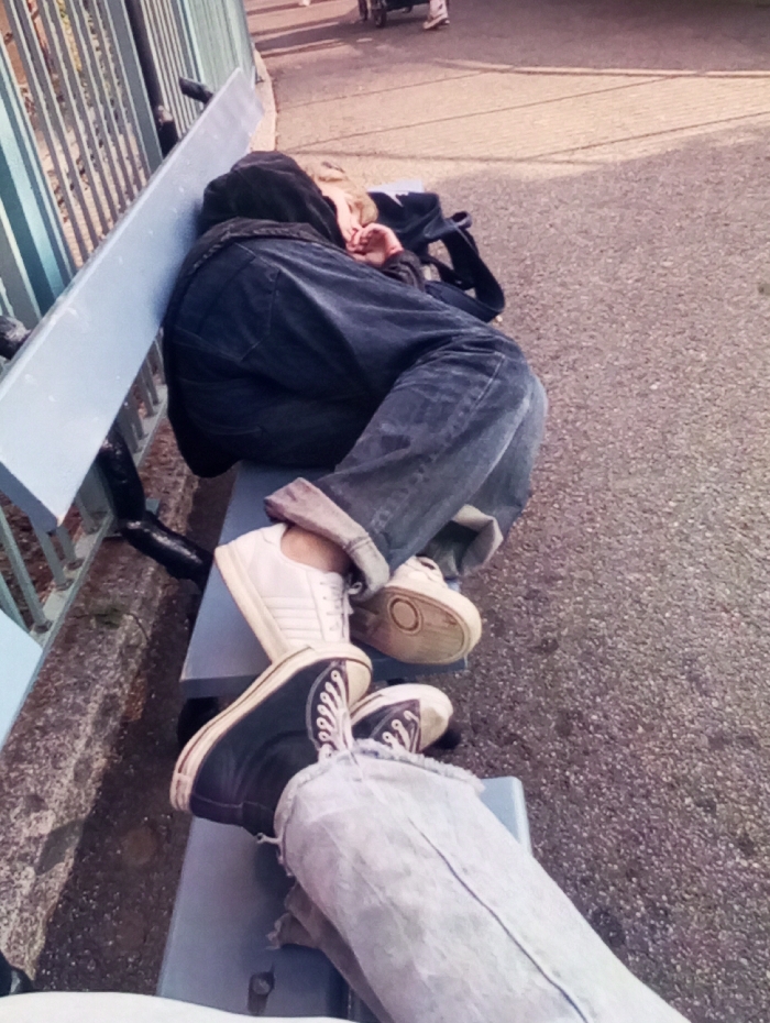 The image depicts a daytime scene in Miękinia, Poland, showing two individuals on or adjacent to a light blue slatted metal public bench. One individual is lying on the bench, facing away from the camera's direct line of sight. This person is dressed in a dark hooded jacket, blue jeans with cuffed hems, and white sneakers, one of which appears to be an Adidas brand with three stripes. Their head rests on their left hand, and a dark bag is positioned near their head on the bench. Their posture suggests they are sleeping or resting. In the foreground, the lower legs and feet of a second individual are visible, implying they are seated on the same bench or directly opposite. This person wears light-wash jeans with distressed areas and black high-top sneakers featuring white laces and soles, consistent with a Converse style. The bench is positioned alongside a dark green metal fence. Beyond the fence is a paved area, likely an asphalt pathway or sidewalk, where faint, out-of-focus figures and objects, including what appears to be a stroller or wheeled item, are discernable in the distance. The ground immediately next to the bench is a coarse, gravelly asphalt. Natural daylight illuminates the scene, creating shadows.