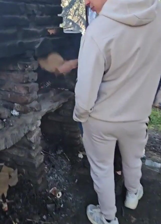 Two men are standing by a stone barbecue pit in an outdoor setting. One man, wearing a gray sweatsuit and white sneakers, stands slightly to the side. The other man, wearing a black shirt, reaches into the barbecue pit with a long-handled spatula, moving a brown paper bag towards a metal grate over hot coals. The barbecue pit is constructed from stacked stones. The ground around the pit is dark and appears to be covered in dirt and debris. In the background, there are trees and other outdoor items, including a tire and what seems to be a trailer.