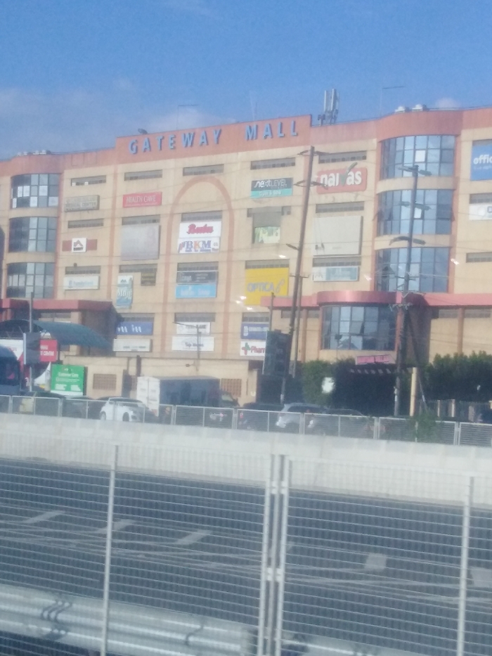 The photo captures the Gateway Mall building, a multi-story commercial structure