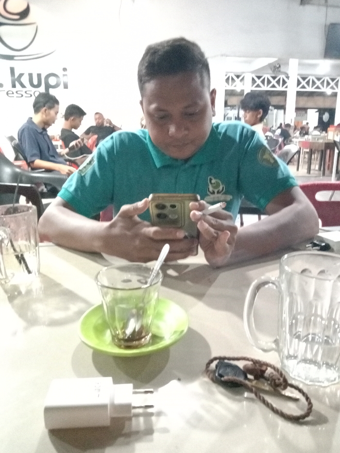 The image depicts an indoor scene at a coffee shop or cafe in Lhokseumawe, Indonesia