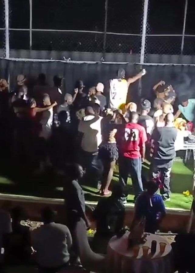 nighttime outdoor gathering with a group of people dancing and socializing. There's a DJ set up with speakers and equipment, and a person wearing a basketball jersey is dancing. People are wearing a mix of casual clothing, and some are sitting on steps watching the activity. The area is dimly lit with string lights and spotlights. There is a fence in the background.