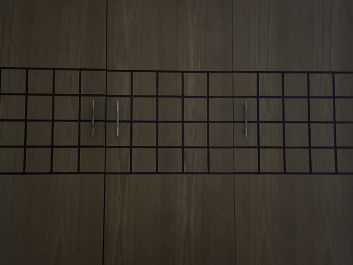A wooden cabinet exhibits a grid pattern across its midsection, delineated by dark lines forming squares. Three metallic, vertical handles are sparsely placed within the grid, each spanning the height of a single square. The wood grain is visible both above and below the grid, indicating a continuation of the cabinet's surface. The lighting is subdued, casting shadows and highlighting the texture of the wood.