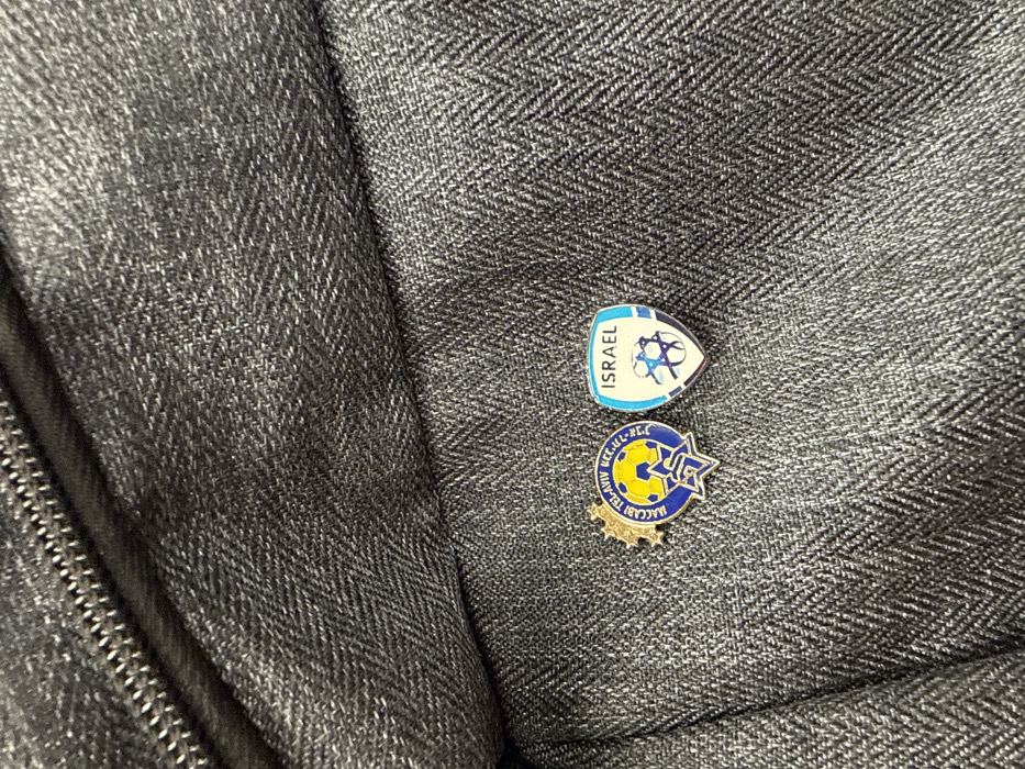 Two lapel pins are centrally positioned on a dark gray herringbone fabric surface. In the upper left quadrant, a dark metallic zipper is partially visible, running diagonally. The left pin is circular with a gold-colored, gear-like edge; it features a blue background, a yellow soccer ball, and a blue Star of David, with Hebrew and English text identifying "Maccabi Tel-Aviv." The right pin is shield-shaped, with a light blue and white background, displaying the word "ISRAEL" and a white soccer ball overlaid with a blue Star of David design. No people or specific actions are depicted. The scene suggests an indoor, stationary arrangement. The specific location within Rishon LeZion, Israel, cannot be determined from the image.