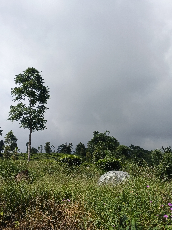 A landscape scene under a cloudy sky. A tall, slender tree stands prominently on the left, contrasting with the low-lying green vegetation. Further back, a cluster of trees and foliage covers the hillside. In the foreground, tall grasses and wildflowers grow abundantly. A large, shiny, dome-shaped object rests among the grass, possibly a greenhouse or shelter. The overall impression is of a rural and somewhat overcast environment.