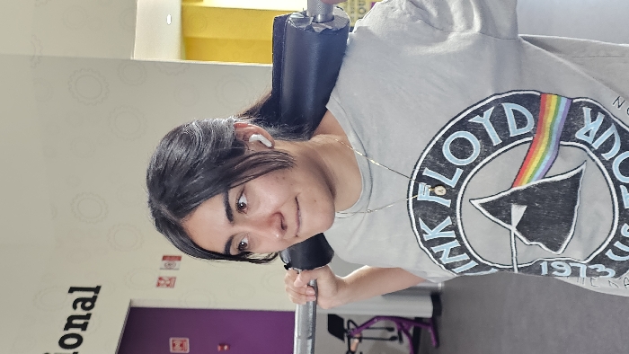 A person with dark hair and fair skin is photographed indoors, wearing a grey T-shirt with a Pink Floyd design, a silver necklace, and a white earbud. They are holding a barbell, equipped with a padded bar cover, across their upper back. The background includes a beige wall with circular patterns, a purple door with warning signs, and a glimpse of a yellow wall. The photo is rotated, positioning the subject at an angle.
