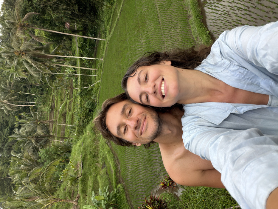 A frontal photograph depicts two individuals, one male and one female, positioned in the foreground against a natural, tropical backdrop. Both subjects are looking directly at the camera and smiling. The male, with light skin and brown hair, is shirtless and positioned slightly behind and to the left of the female. The female, with light skin and dark wavy hair, is wearing a light blue, unbuttoned collared shirt over a lighter undergarment. The background features a landscape of terraced rice paddies, consistent with the Tegal Suci region of Indonesia. Young green rice plants are visible in flooded fields across multiple tiers, interspersed with numerous tall palm trees and dense tropical foliage on the surrounding hillsides.