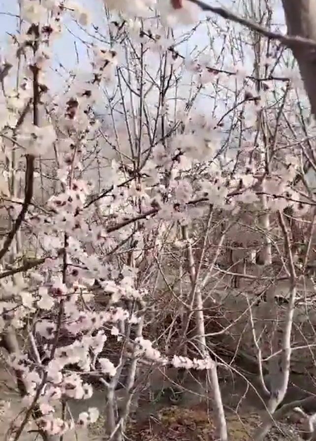 The camera moves slightly, showcasing a tree in full bloom. The flowers are white with a hint of pink. The branches are thin and intricate. In the background, a landscape of bare trees and hills is visible under a bright sky. The ground is dirt-colored. A smaller tree in the foreground is partially obscuring the view initially.