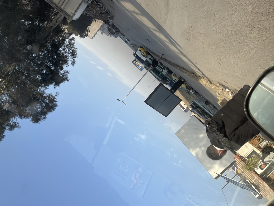 A street scene is captured from inside a vehicle. The view includes a tree, buildings, and a street with vehicles. A large, rectangular billboard stands beside the road. Reflections are visible in the windshield, showing a person in a dark coat and the interior of the car, including the side mirror. The sky is light blue, and the overall image has a slightly rotated perspective.
