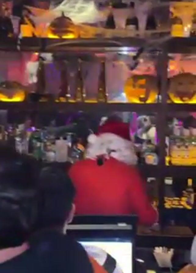 dimly lit bar decorated for Halloween. The shelves behind the bar are stocked with bottles and adorned with lit pumpkins and fake spiderwebs. Several people stand at the bar. One person is dressed as Santa Claus and appears to be serving drinks. Another person has white makeup on their face with dark accents. A screen is visible at the bar. Loud music plays in the background.