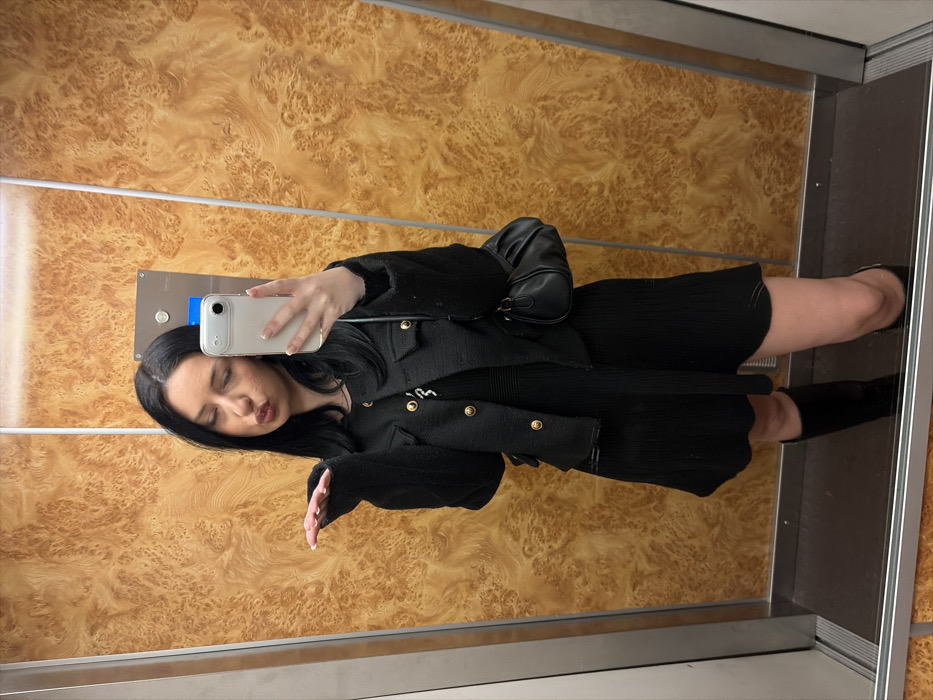 A woman in a black outfit takes a selfie in an elevator. She wears a short, pleated skirt, a jacket with gold buttons, and black boots. A small, black bag hangs over her shoulder. Her hair is dark, and she has fair skin. The elevator interior has a wooden veneer wall and metal trim. She holds a smartphone up to capture the image in the elevator's mirrored surface.