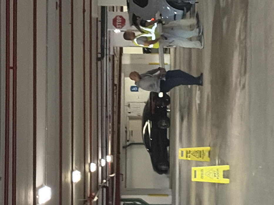 A parking garage scene showcases a black sedan positioned between two "wet floor" signs. A man in a gray shirt and jeans stands nearby, while further down the lane, two workers are seen by a silver car near a "stop" sign. Fluorescent lights illuminate the structure, with red piping adding a linear element to the white walls. A handicapped symbol is also visible on the wall.